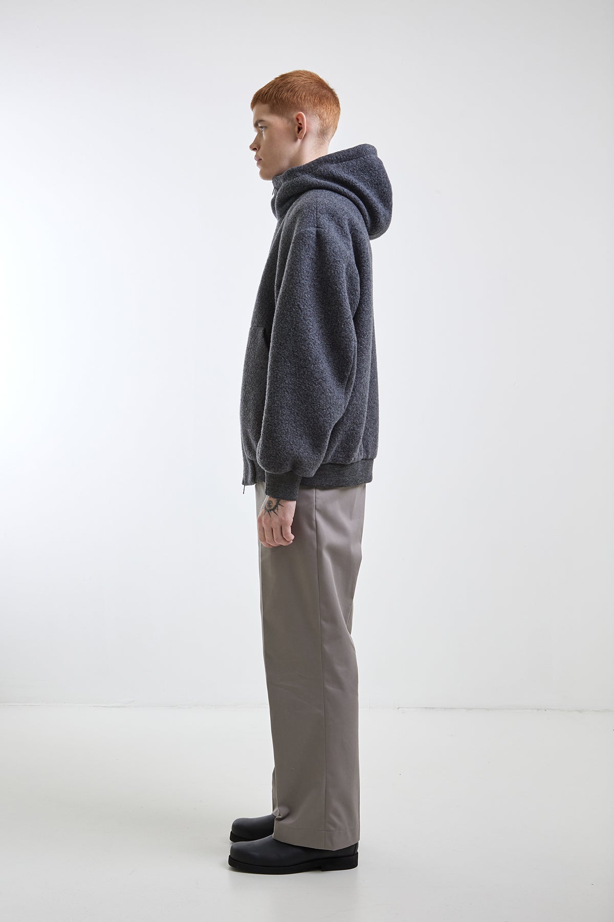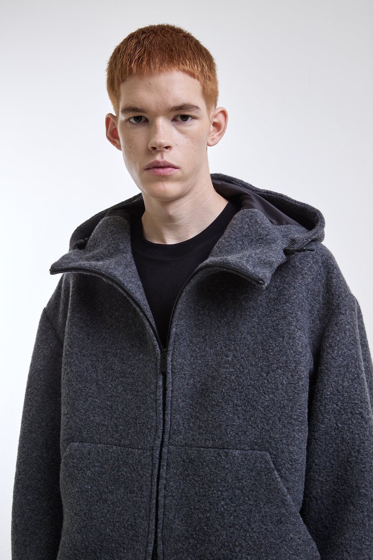 Bomber jacket made of teddy wool blend with linings of 95% polyester and 5% elastane, featuring a hidden double-slider zip closure. Patch pocket inserted in the seam with a hidden snap button and lined with 100% cotton. Drawstring in the hood. Ribbed hem and cuffs.