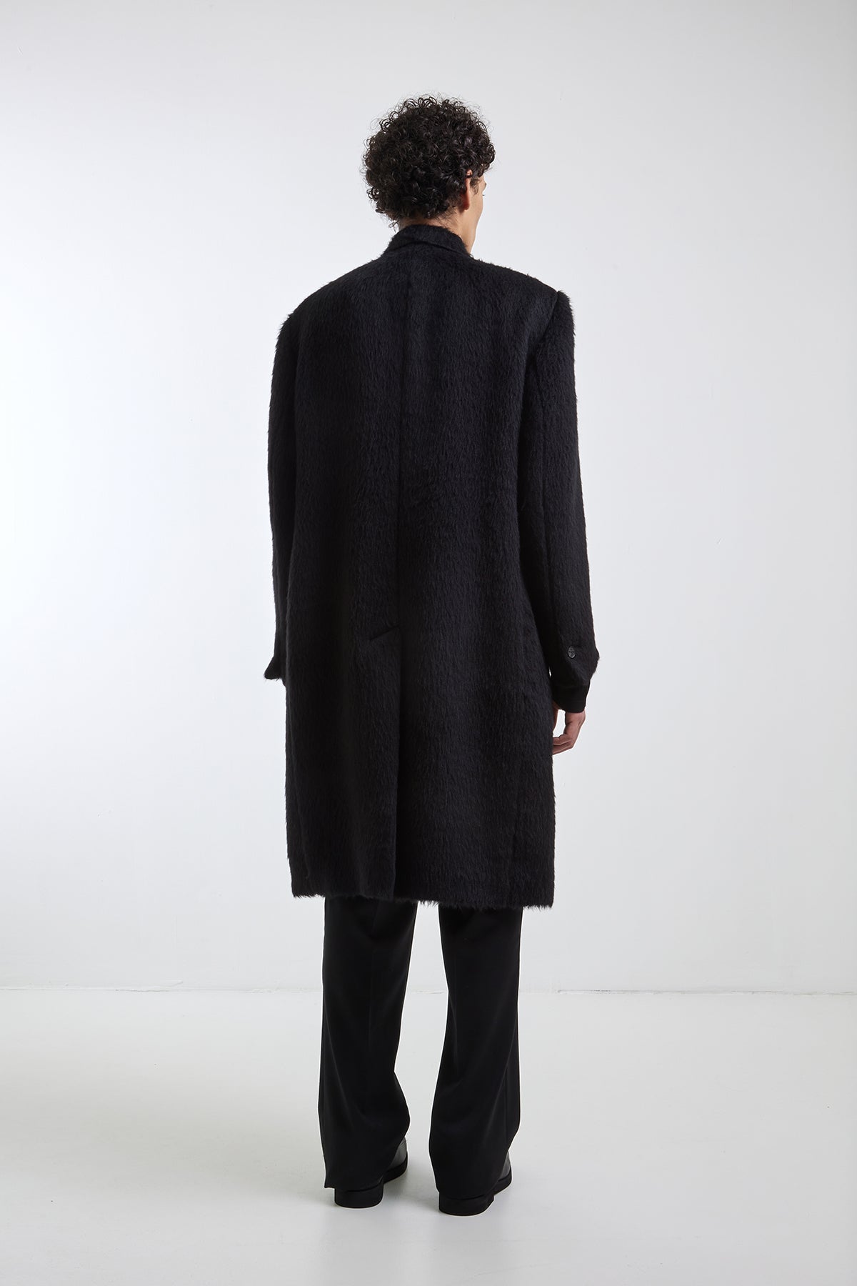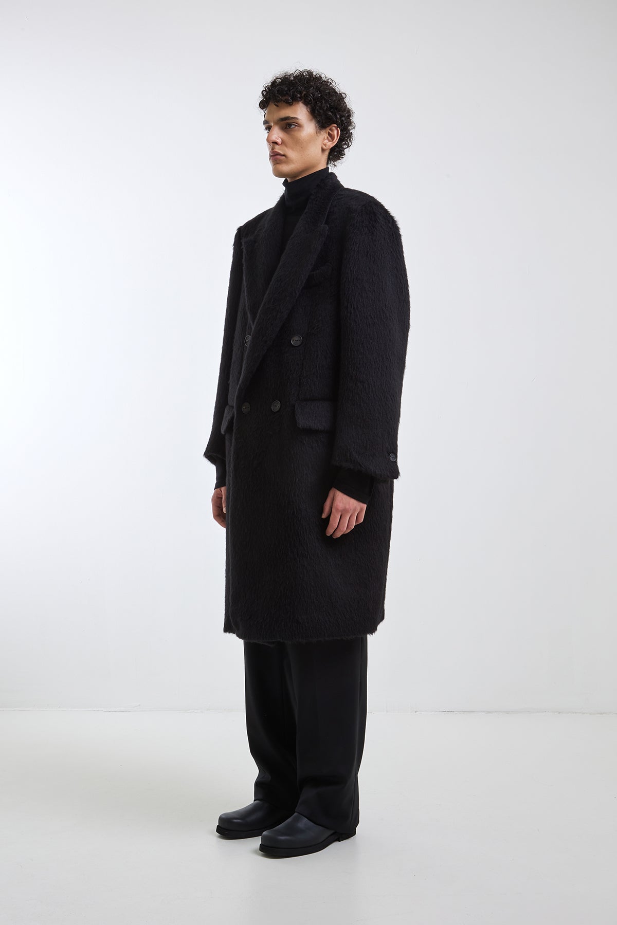 Double-breasted coat made of baby llama fabric with 100% polyester lining, featuring four buttons and dart lapels. Flap pockets and a pocket on the left side at chest height lined with 100% cotton. Single vent at the center back.