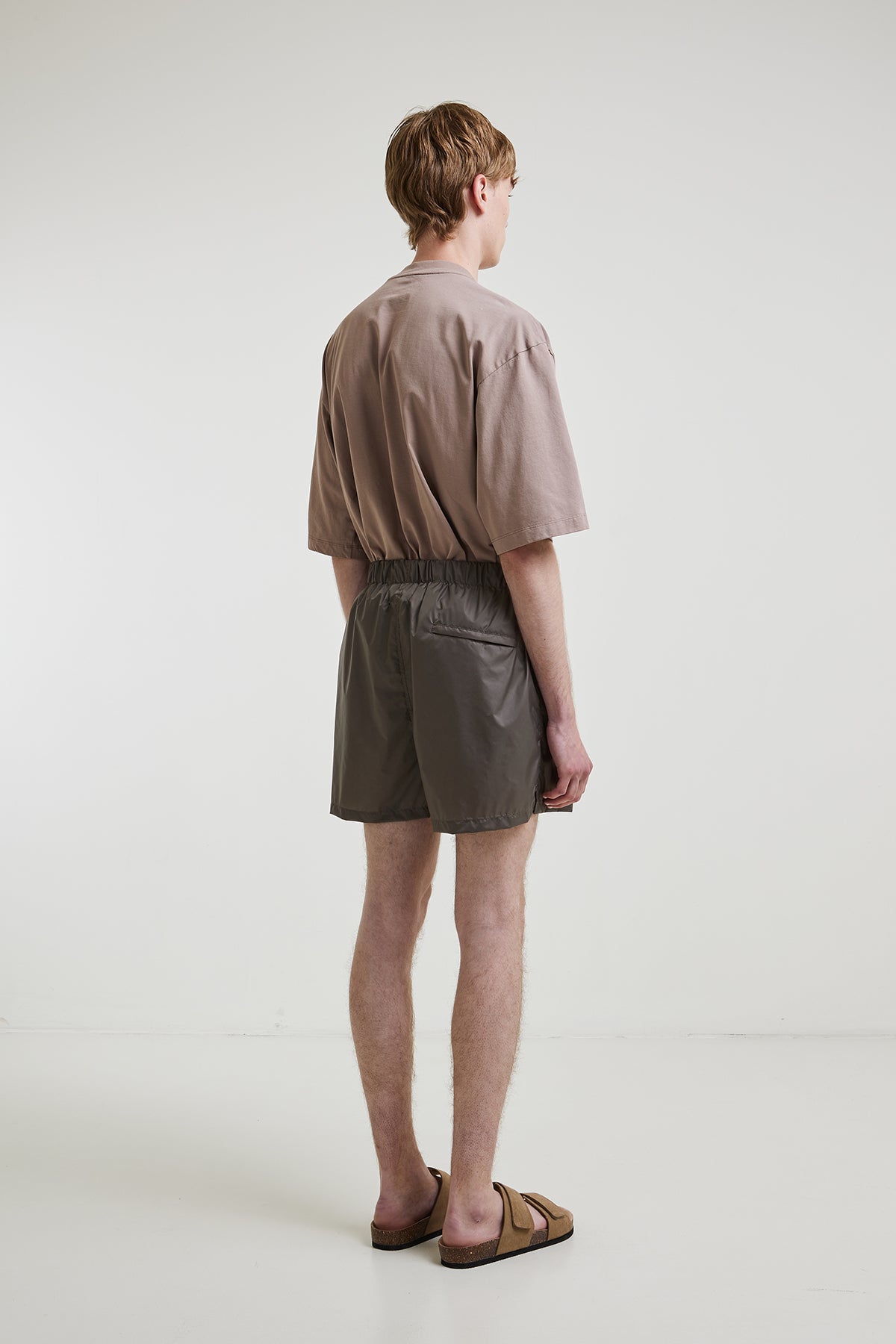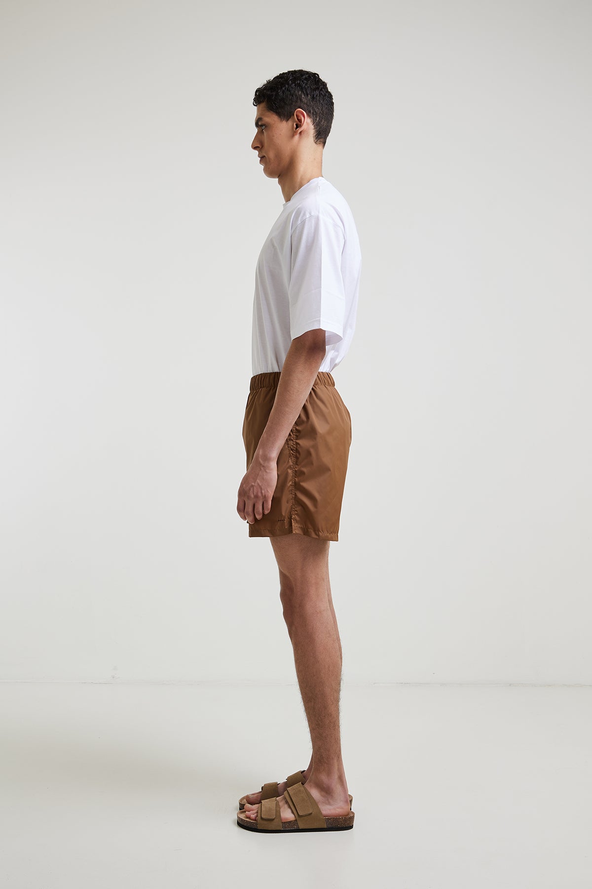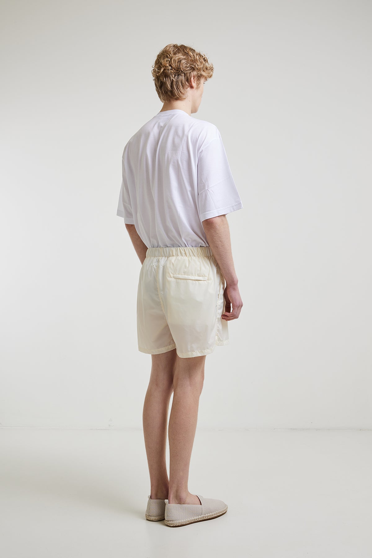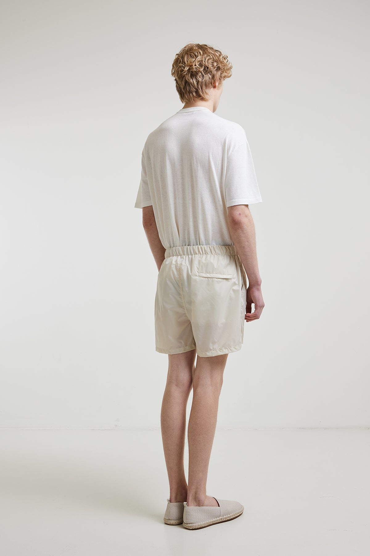 Lightweight nylon swimsuit with internal drawstring at the waist, slanted side pockets, and a welt pocket with zipper at the back, with breathable inner lining.