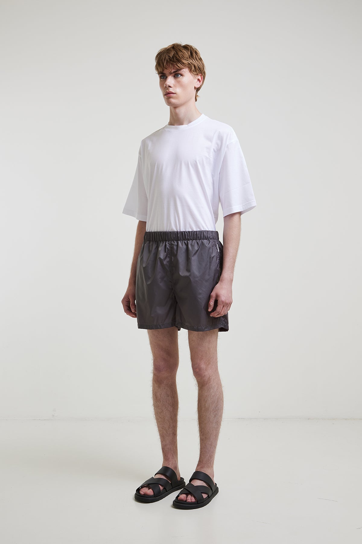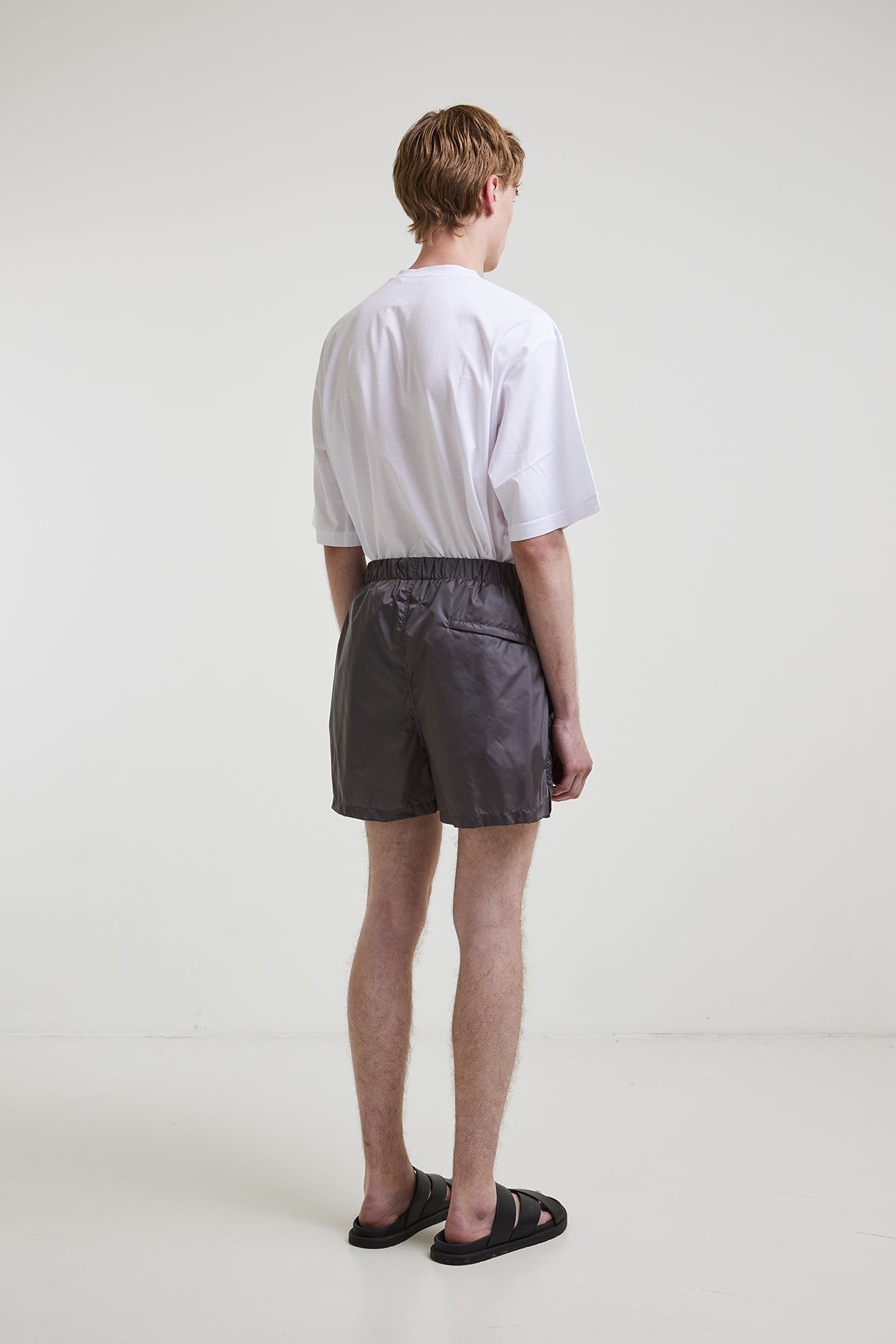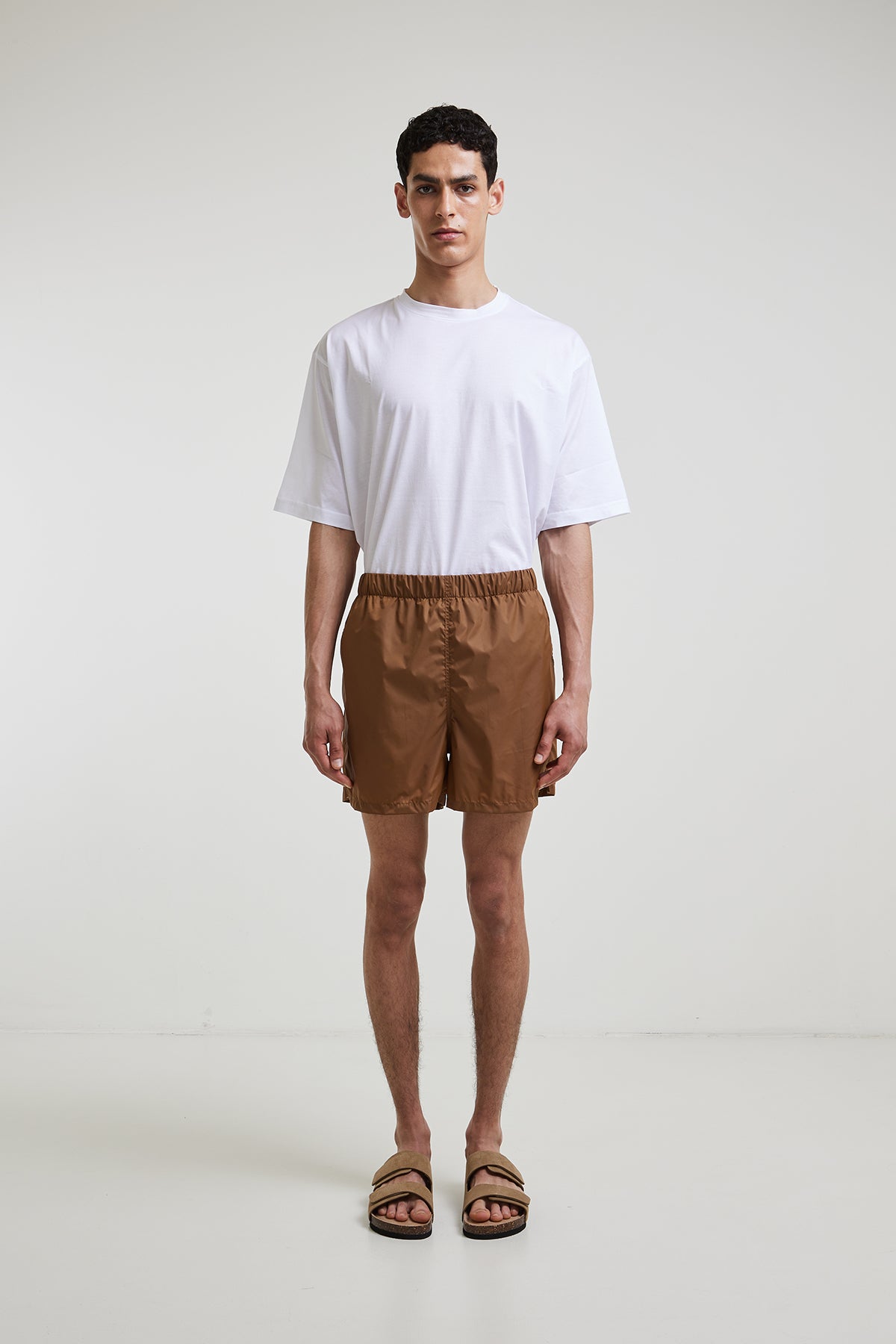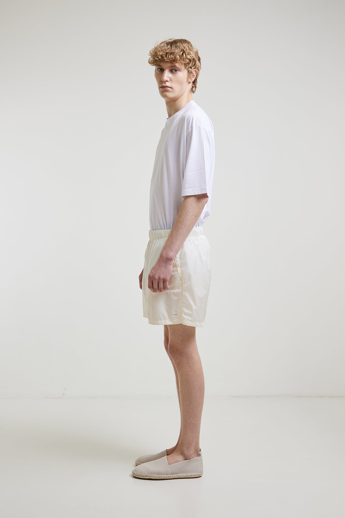 Lightweight nylon swimsuit with internal drawstring at the waist, slanted side pockets, and a welt pocket with zipper at the back, with breathable inner lining.