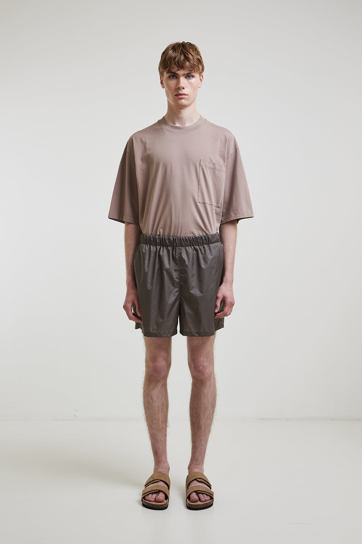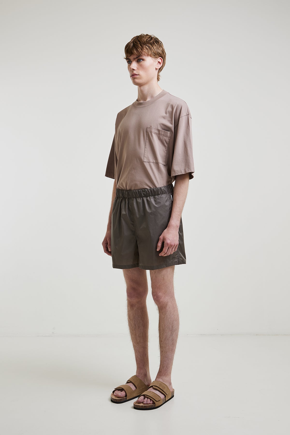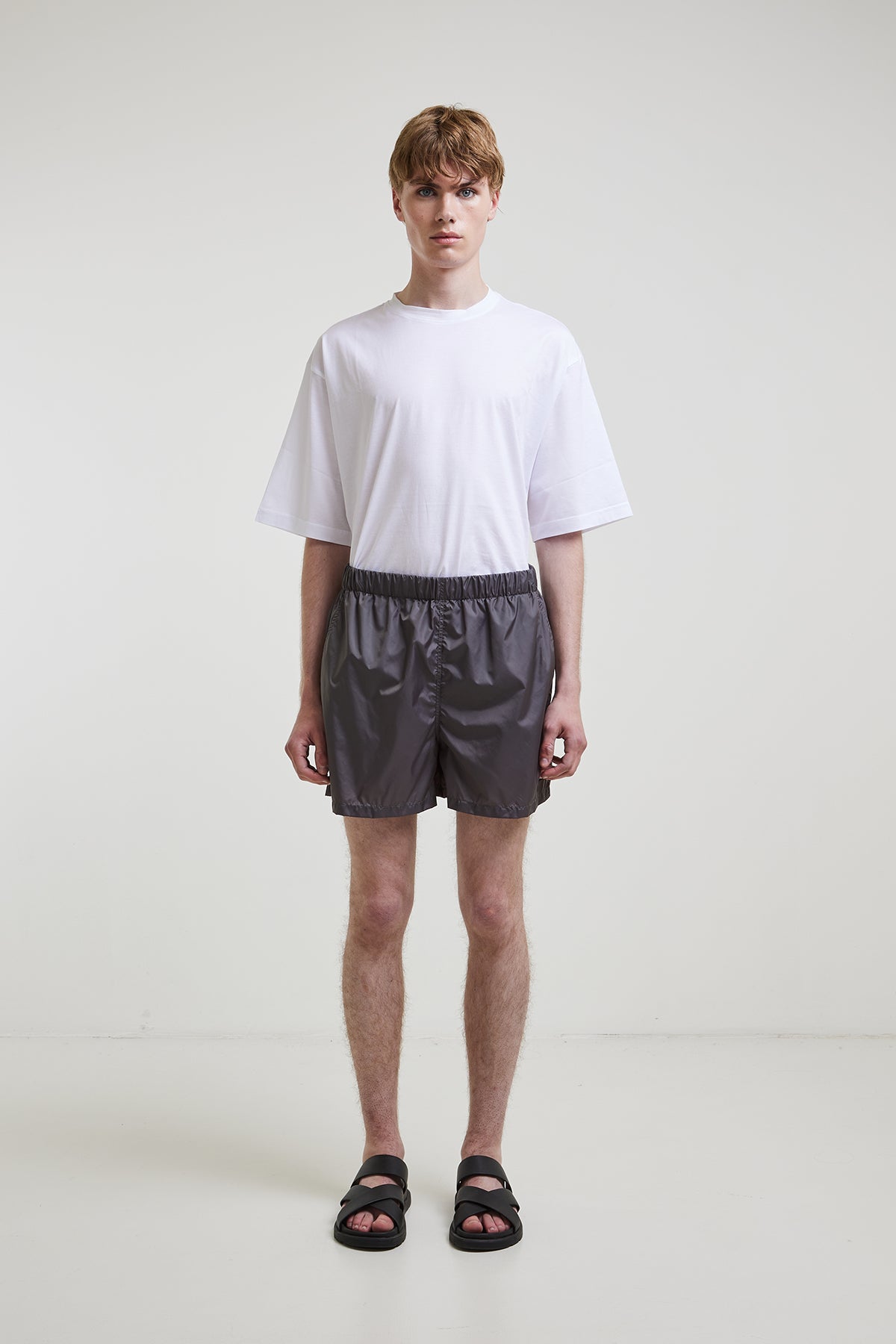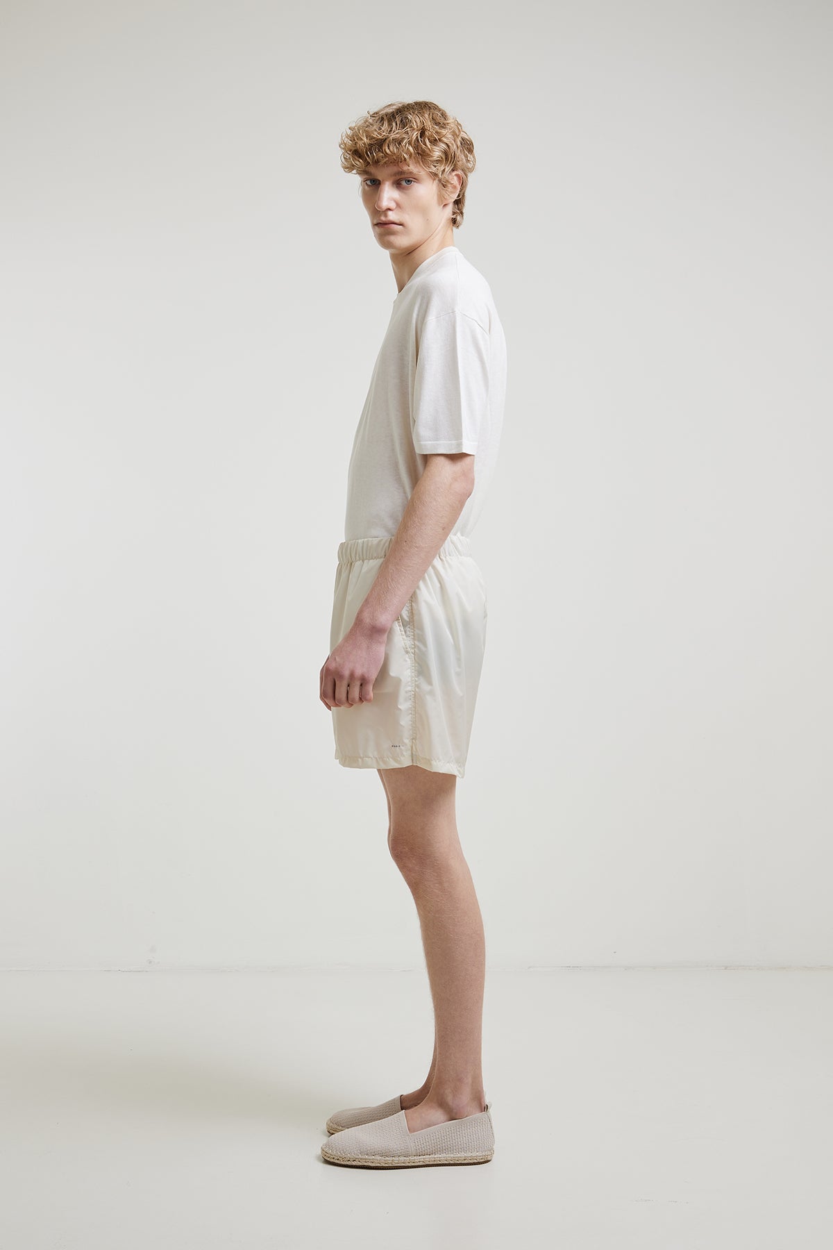 Lightweight nylon swimsuit with internal drawstring at the waist, slanted side pockets, and a welt pocket with zipper at the back, with breathable inner lining.