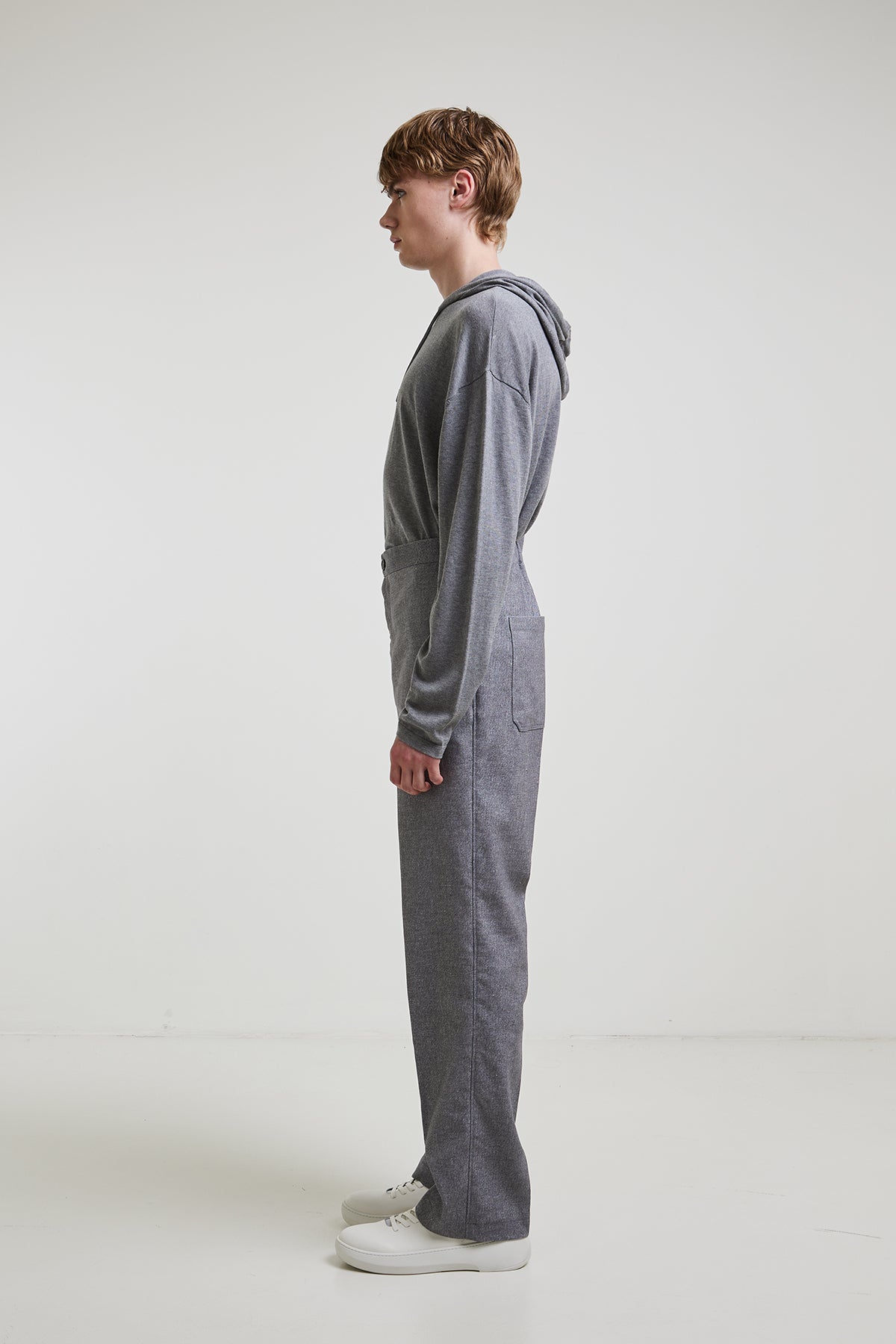 Regular-fit pants in linen-cotton blend denim, with slanted side pockets and patch pockets at the back. Faux fly with zip and double button closure, elasticized back waistband, and center crease along the leg. Bottom: 24 cm.